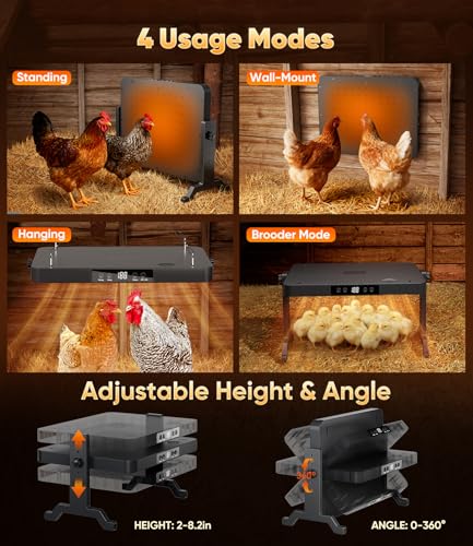 ?4 Usage Modes?From newborn chicks to fully-grown hens, our chicken heat plate adapts to every stage. For adult chickens, choose from 3 modes: Standing, Wall-Mounted, or Hanging. For chicks, use the Lay-flat Brooder Mode ( 2" to 8.2" height adjustable — simply adjust as they grow). The 360° rotation directs heat exactly where it's needed. The package includes: 15.3" x 11" x 1.2" Coop Heater x 1, Remote x 1, Legs x 2, Hanging Straps x 4, Hanging Hook x 1, Screws x 3, Manual x 1