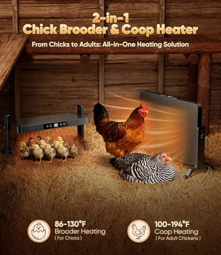 ?2-in-1 Chick Brooder & Coop Heater?The chicken heater is designed for your flock’s entire lifecycle, providing precise temperature control at every stage. From the gentle warmth (84-100°F for chicks) to the powerful heat (100-194°F for adult chickens), it meets all their needs. One device combines the functions of both a brooder and a coop heater, saving you time, effort, and money!