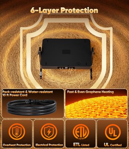 ?Overheat Protection & Peck-Resistant Power Cord?Our chicken warmer is ETL and UL certified, meeting the highest electrical safety standards. The built-in smart thermostat precisely controls the temperature and is equipped with an overheat protection system. If the actual temperature exceeds the set temperature, it will automatically shut off to eliminate fire hazards. The 10ft Peck-Resistant, Water-Resistant Power Cord is durable and wear-resistant, effectively preventing damage and short-circuit risks caused by poultry. With multiple layers of safety protection, you can rest assured.