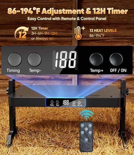 ?Wide Adjustable Temp & Timer?Chicken heaters inside the coop offer precise heating from 86°F to 194°F (13 levels) and a 12H timer (0H/3H/6H/9H/12H). Ensure a warm, cozy coop in winter, maintaining the ideal temperature that safeguards your flock's health and ensures egg production at its best. The timer automatically avoids energy waste, effortlessly slashing your electricity bills.