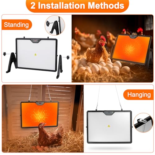 ?Flexible Installation Options?: This versatile chicken coop heater can be easily set up in two ways to suit your coop's layout. Option one: 360 degree rotation angle adjustable. Install it in a standing position by securing the adjustable feet with screws to the heating plate. Option two: Remove the feet and use the included 1-meter steel wires to hang the brooder plate. This flexibility allows for placement in any space, large or small.