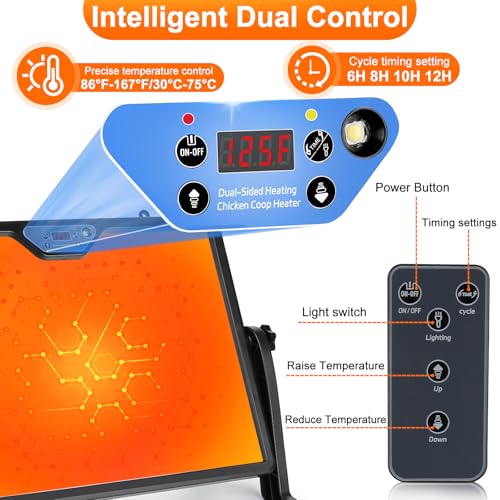 ?Smart Dual Control with Remote Operation?: Our chicken coop heater comes with both a smart control panel and a remote control for easy operation. Adjust the temperature directly on the heating board or use the remote from up to 30 meters away—perfect for remote management, especially in larger coops.