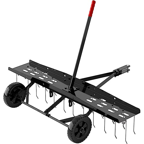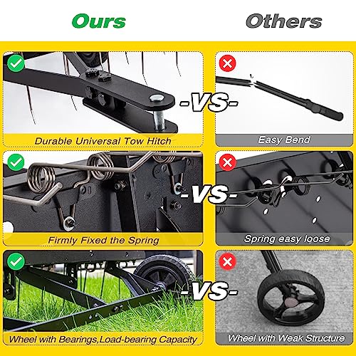 Durable Structure with 24 spring tines: Suchtale Tow Behind Dethatcher is a outdoor yard tool for uproots dead, matted grass and dislodges hard-packed dirt for planting easy thatch removal. For the 24 spring tines, made of rust-proof and replaceable spring-loaded tines are heat-treated for greater durability, stay flexible and guarantee performance. Wheels track behind to reduce the interference with lawn obstacles. Tips: Clean the working part from any soil residue after use.