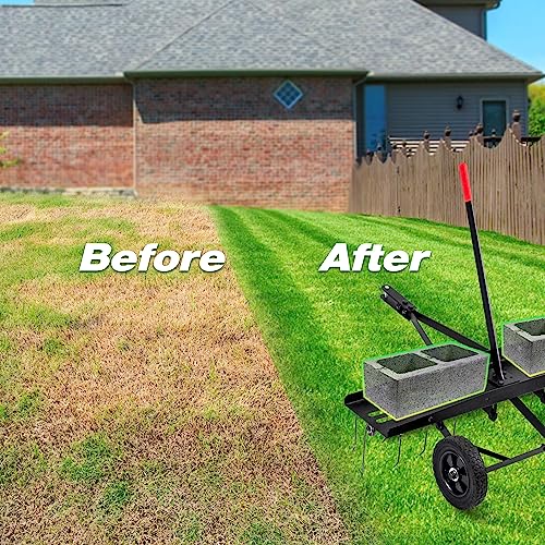 Easy to Use and Effort Saving: Operate easily with hitch pin, you can hook this heavy-duty to make up, and then start dragging. The structure of the wheel with bearings gives it a greater load-bearing capacity. Transport handle for easy raising and lowering of the tines. You can use it to level yard garden, patio, lawn, farm. There is no need to make a big deal to dig. With this Tow Behind Dethatcher, make your garden look fresh at any time. 70 lb ballast platform full whole steel frame.