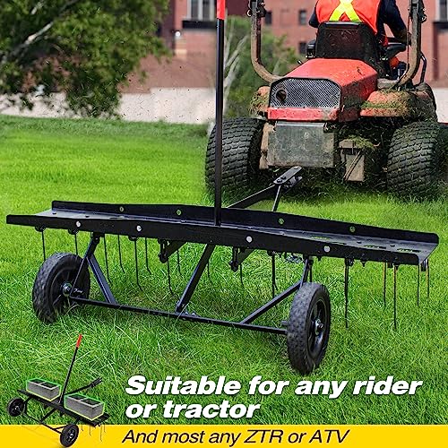 Easy to Install: 48-Inch grass tractor rake with detailed and completed instruction manual, includes Manual with parts break down and full pictorial assembly instructions. Assembly video also available. You can assembly the dethatcher according to the instruction, it will save your time. Pin-style hitch allows for quick and easy hitching or removal on ATVs or riding lawn mowers, with no additional equipment necessary.