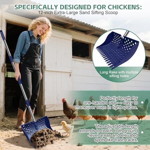 ?Removes Up to 3x More Waste — Thanks to Innovative Multi-Shape Sifting Holes?? The extra-large 12" chicken coop rake features three distinct sifting hole shapes and sizes — round (0.315"), oval (0.472" x 0.315"), and honeycomb pattern (0.394") — designed to quickly separate manure from sand or coarse bedding materials. This results in removing up to three times more waste compared to other scoopers. The optimized width and precise hole sizing maximize bedding retention while ensuring thorough waste removal, helping you save money on bedding.