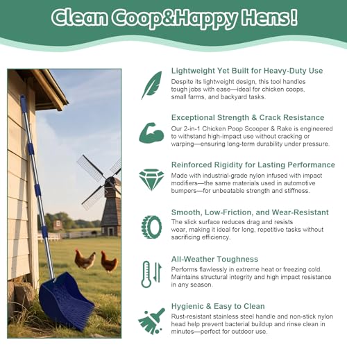 ?Premium Materials for Rugged Construction?? Crafted from automotive-grade nylon reinforced with impact modifiers, the scoop head delivers unmatched strength and durability to withstand heavy use. Its ultra-smooth surface minimizes resistance and resists wear and tear — even under the toughest conditions. Paired with a lightweight, rust-proof stainless steel handle, this chicken poop scooper thrives in scorching heat or freezing cold without losing its edge.